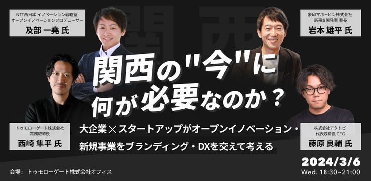 関西を拠点にエンタープライズ企業に対して事業開発、DX支援を行っているアクトビが、インナーブランディングからアウターブランディングまでを一貫して手掛け、数十社の企業理念構築に携わるトゥモローゲート株式会社と共に、対談イベント「関西の”今”に何が必要なのか?大企業✕スタートアップがオープンイノベーション・新規事業をブランディング・DXを交えて考える」を開催します。